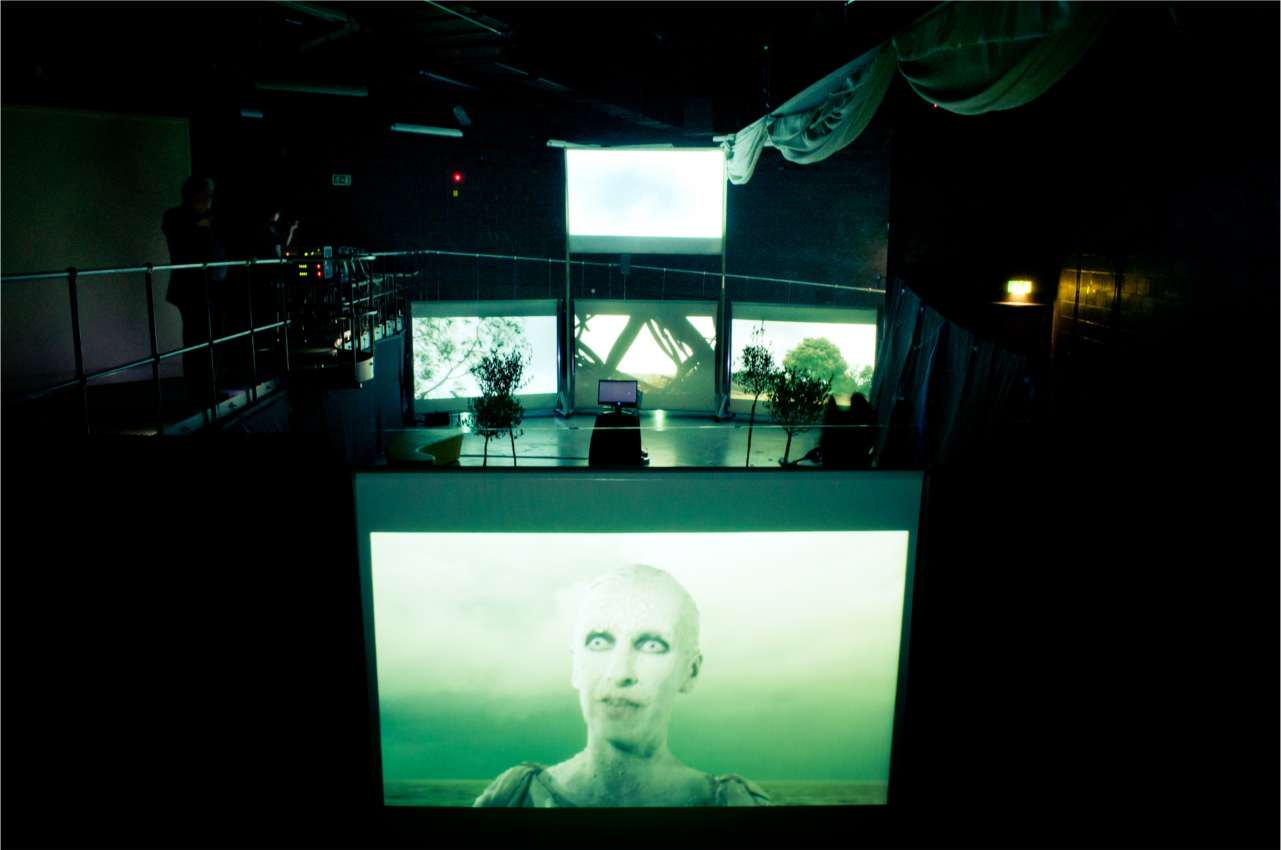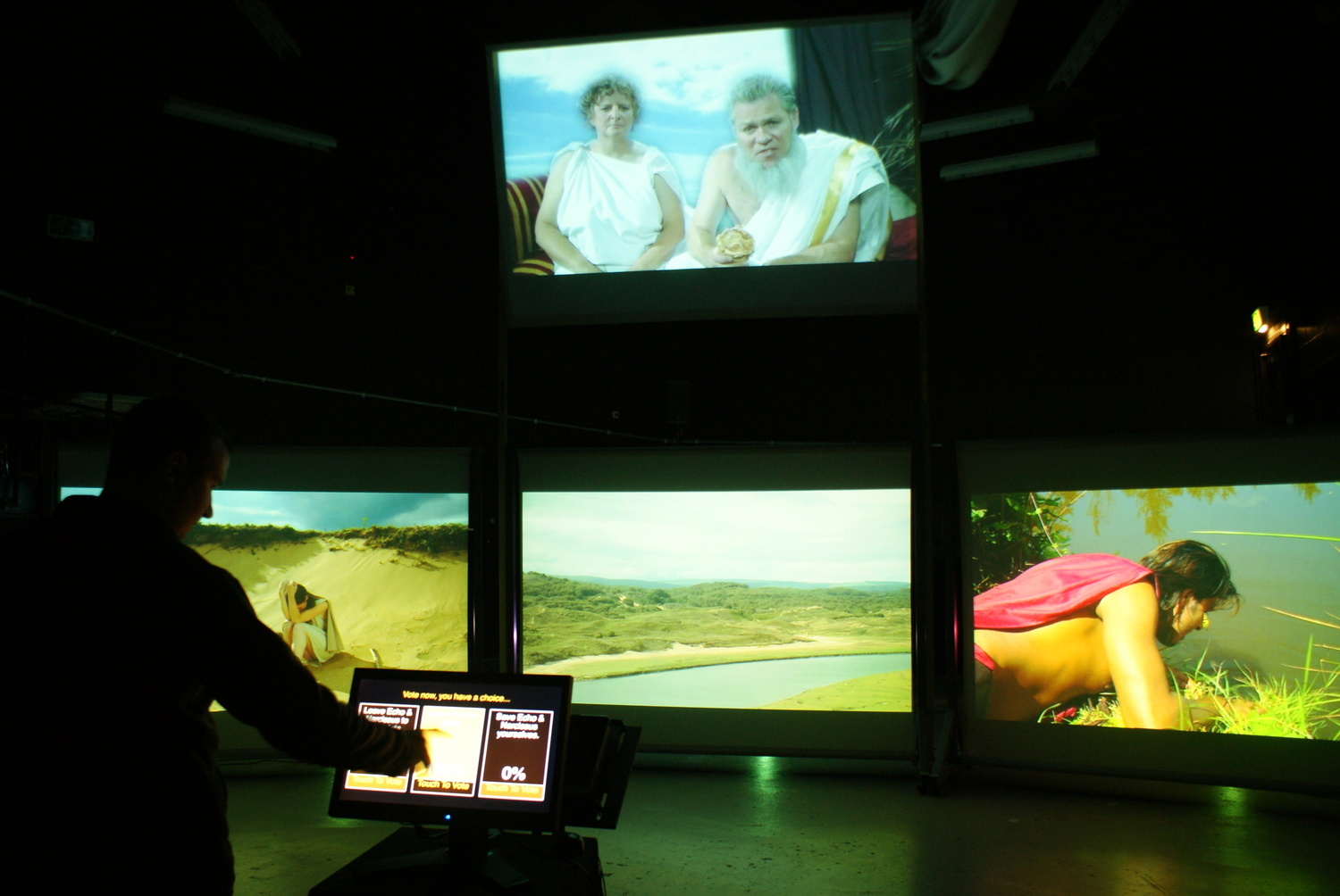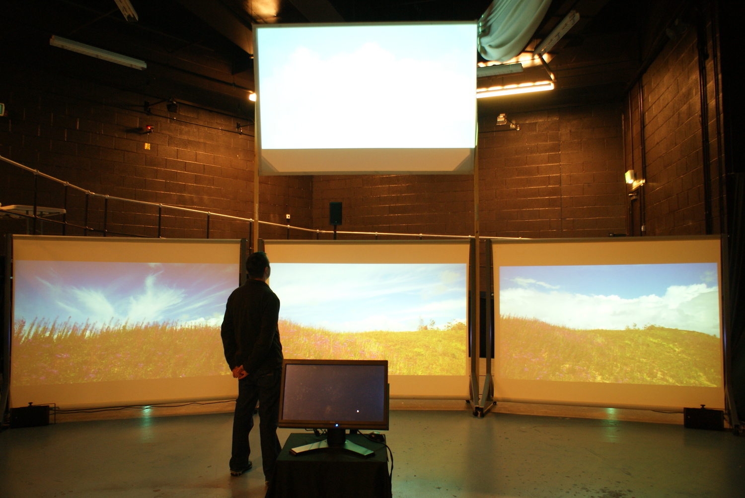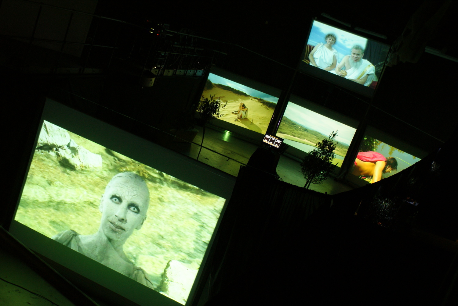 Here are stills from the Riverfront show, indicating the screens, the space, and spectators: