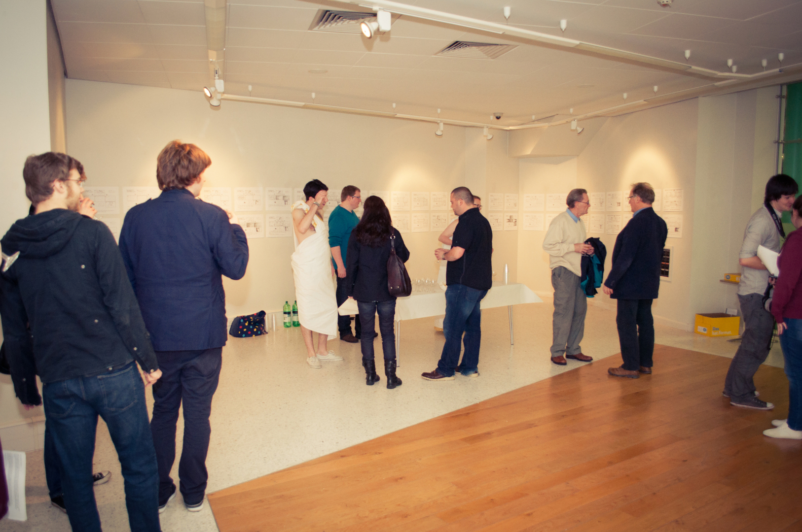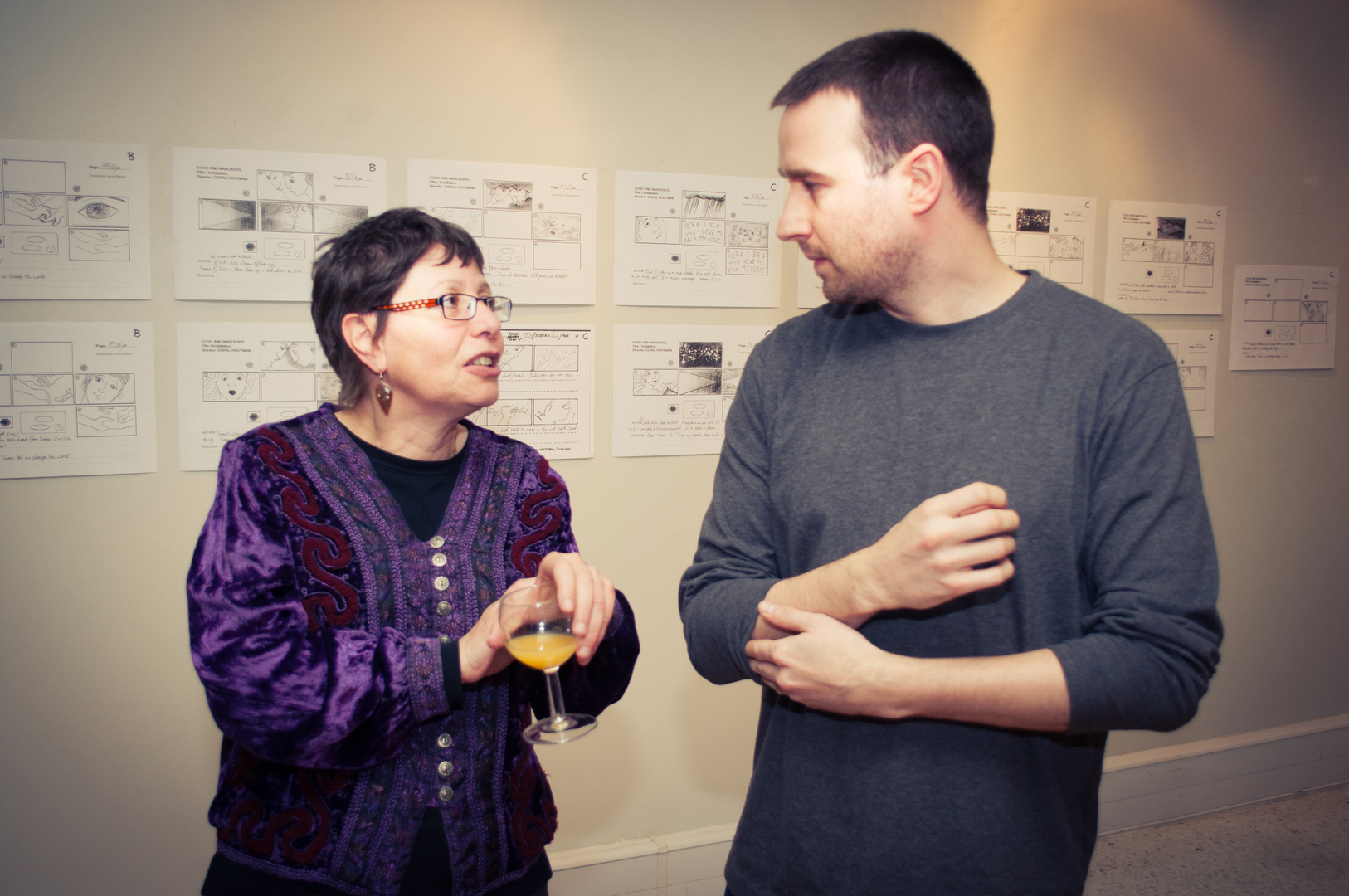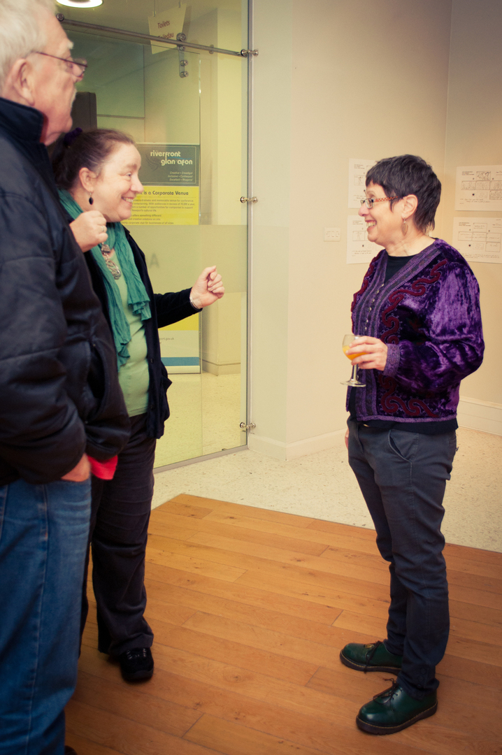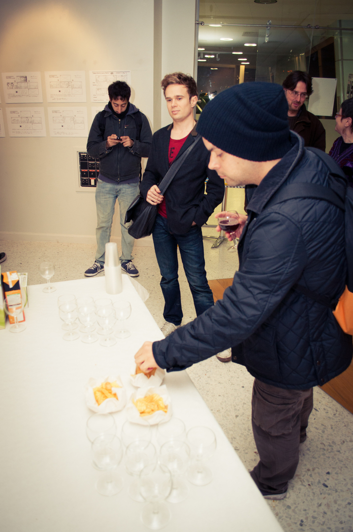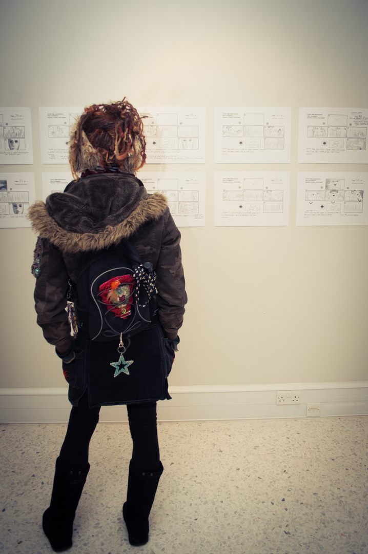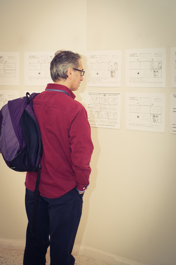 The private view was at the Riverfront on Friday 4th November at 5.00. This white cube gallery was a reception space where we displayed the storyboard around the room, provided wine and met the guests (Luke and Charlotte dressed in Greek costume) and then we guided them down a stairwell, decorated with production stills, and into the exhibition space. The design by Anton was designed to give them an experience of entering an olive grove, dimly lit, until they reached the exhibition space.