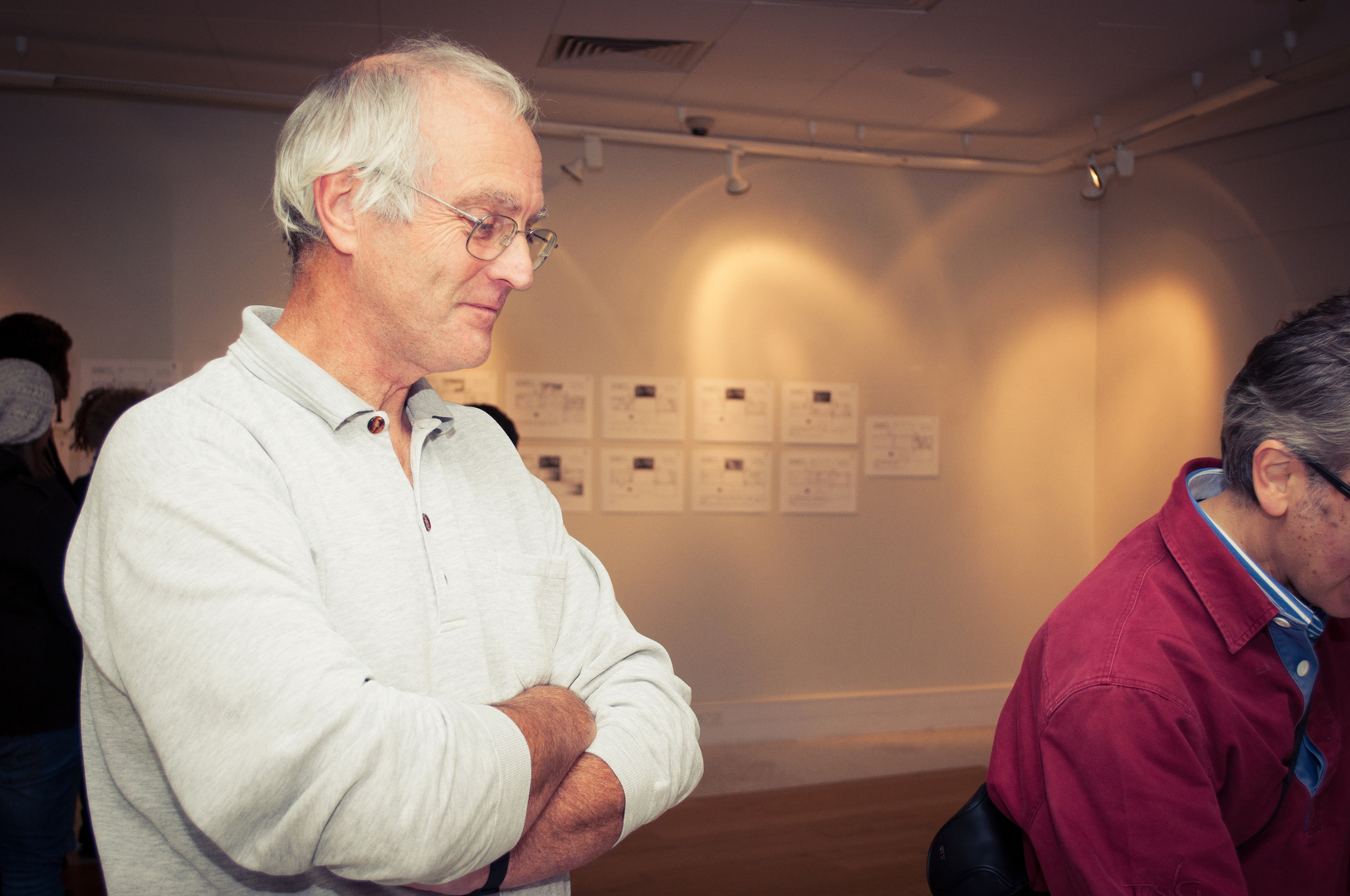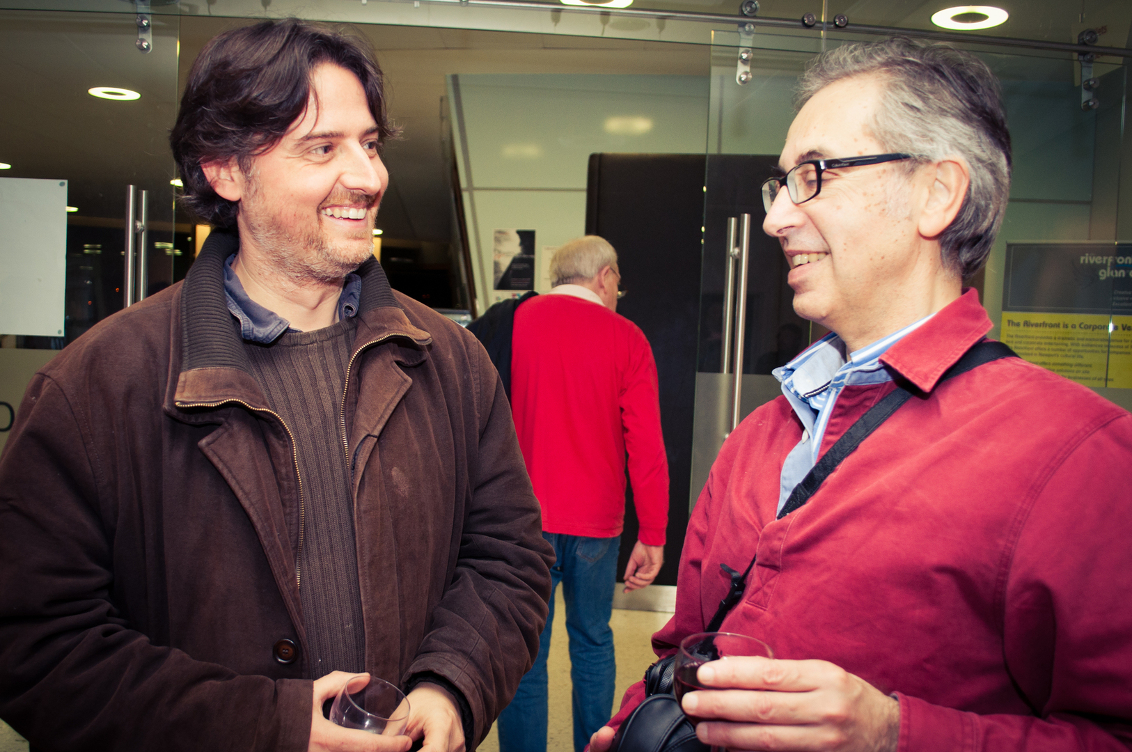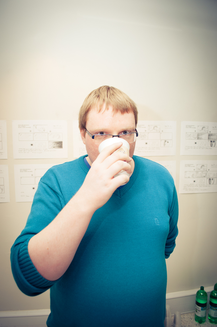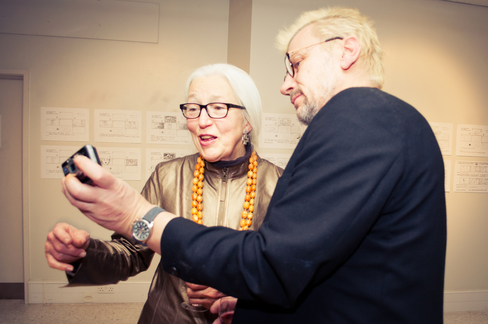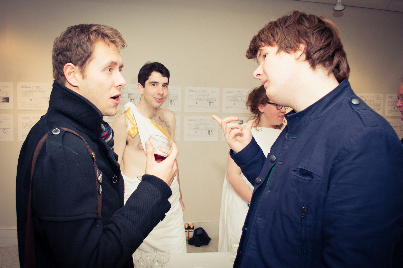 The private view was at the Riverfront on Friday 4th November at 5.00. This white cube gallery was a reception space where we displayed the storyboard around the room, provided wine and met the guests (Luke and Charlotte dressed in Greek costume) and then we guided them down a stairwell, decorated with production stills, and into the exhibition space. The design by Anton was designed to give them an experience of entering an olive grove, dimly lit, until they reached the exhibition space.