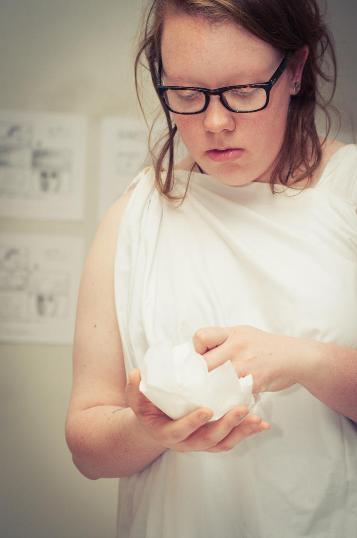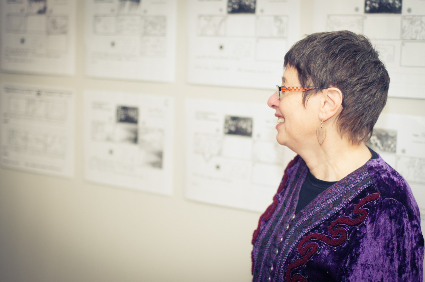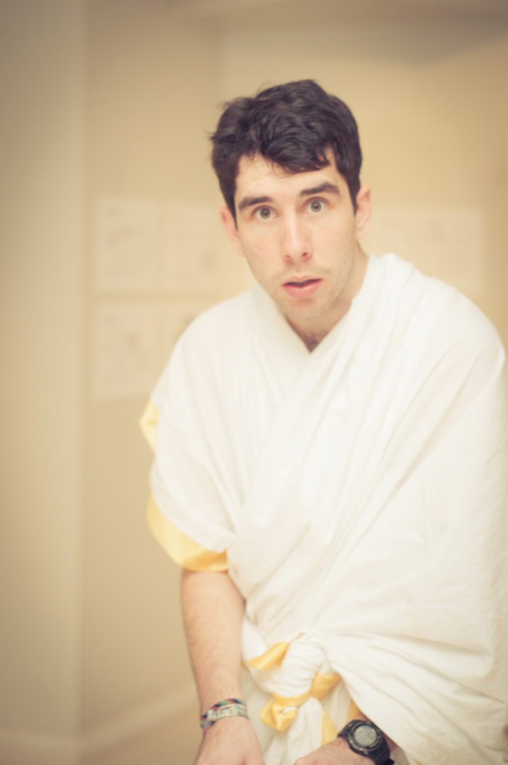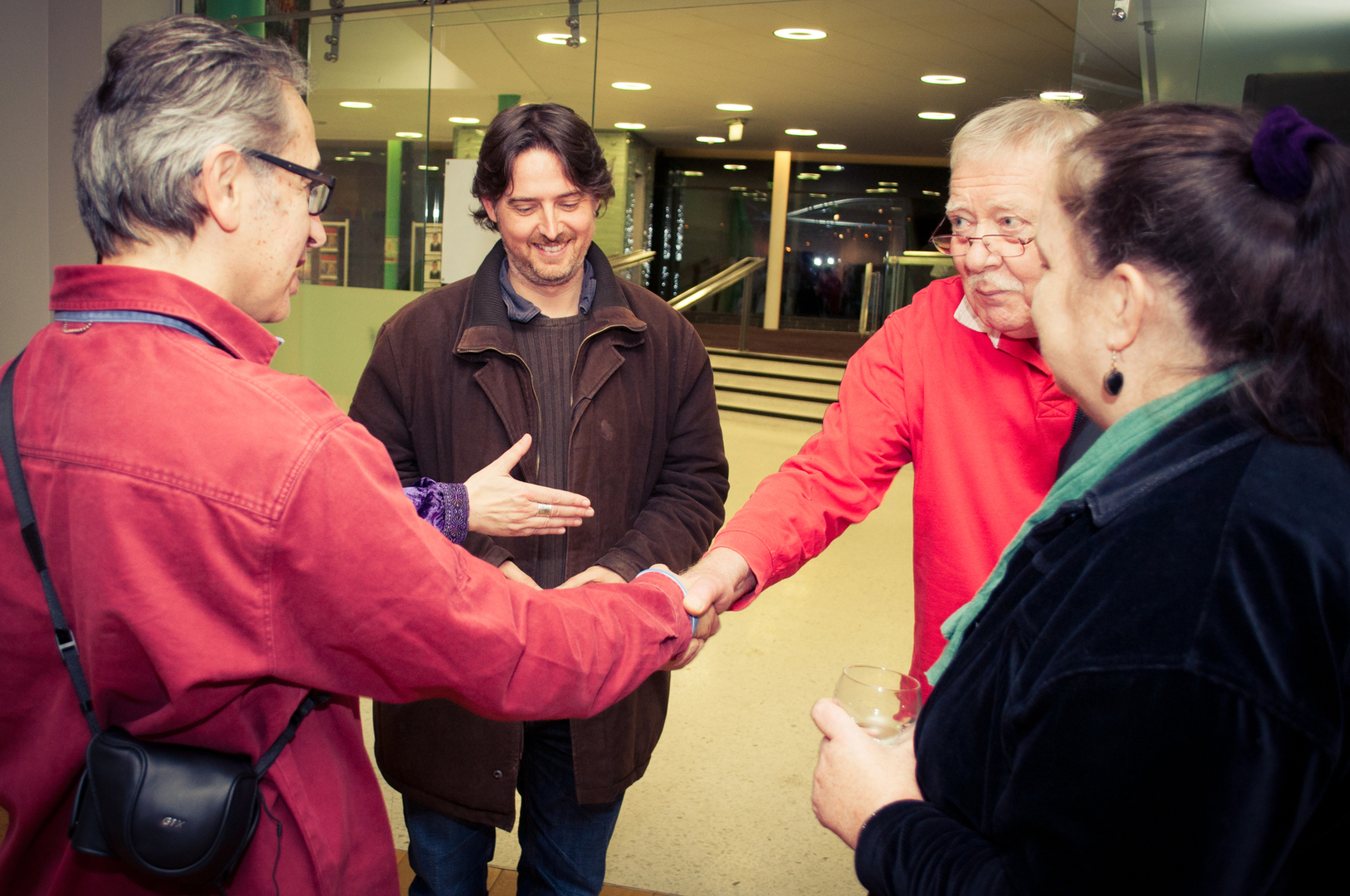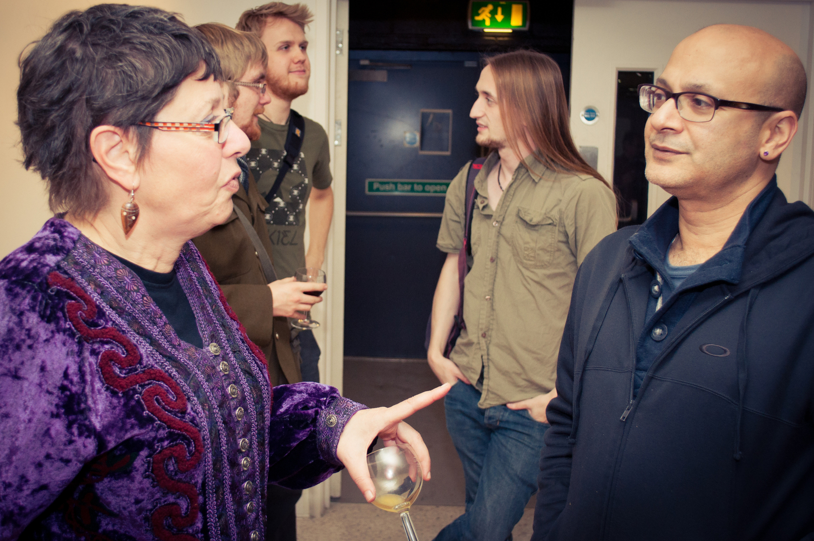 The private view was at the Riverfront on Friday 4th November at 5.00. This white cube gallery was a reception space where we displayed the storyboard around the room, provided wine and met the guests (Luke and Charlotte dressed in Greek costume) and then we guided them down a stairwell, decorated with production stills, and into the exhibition space. The design by Anton was designed to give them an experience of entering an olive grove, dimly lit, until they reached the exhibition space.