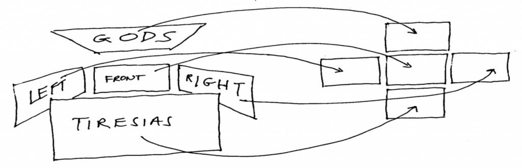 At the end of the drama (the above video), when Tiresias was urging the audience to choose an ending, viewers were able to select one of three endings below from a touch sensitive CHOICE SCREEN (see plates 6 – 8 of the Installation page). The ending was triggered by the largest number of people touching the particular option. Other methods of audience involvement, such as voting with pebbles in amphorae, as in Ancient Greece, would be possible.